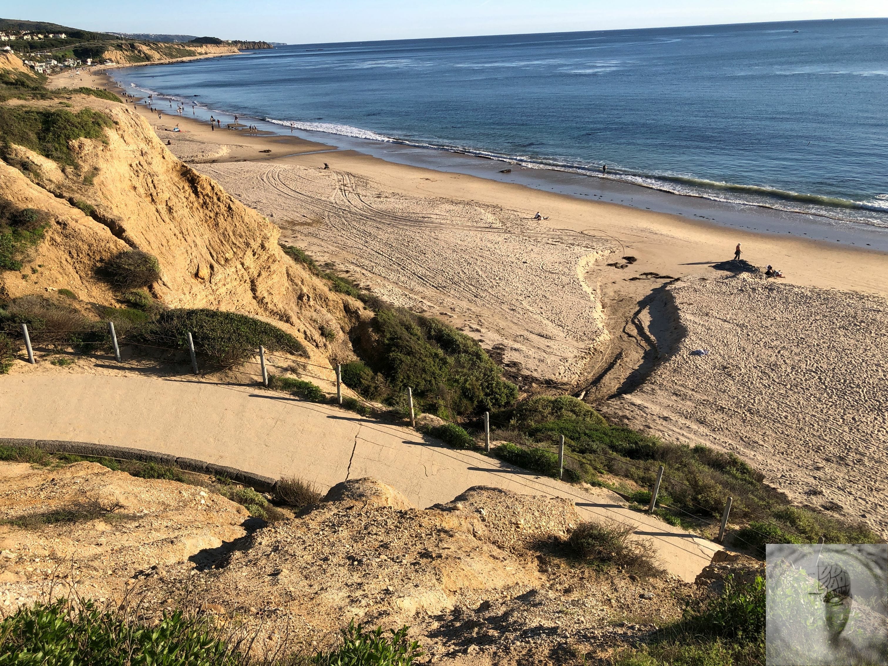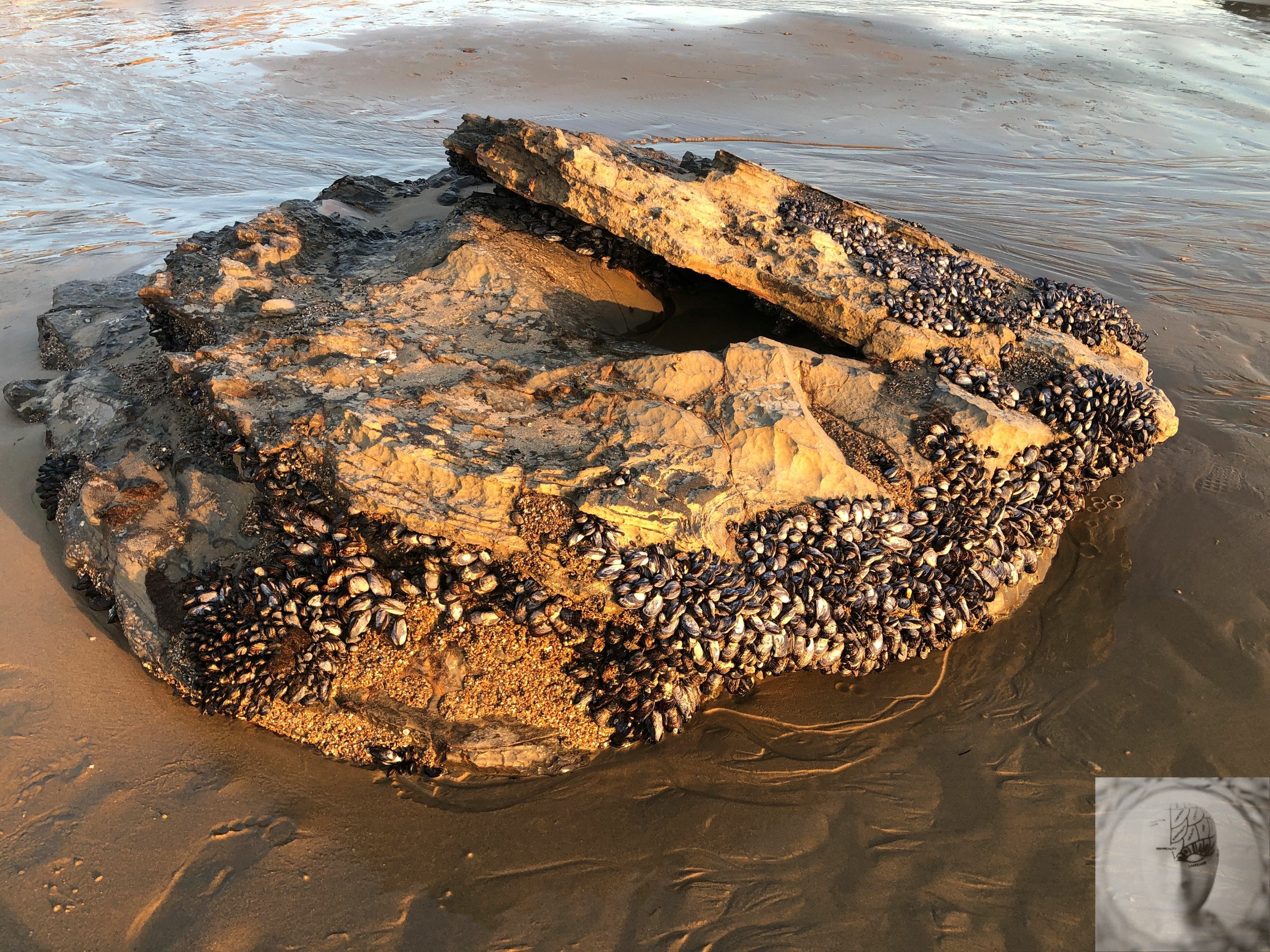 The opening image shows a rock formation with a distinctive hollow—a natural space where something might form, surrounded by mussels that have colonized the edges, with human footprints visible in the wet sand nearby (you do have to look closely!). The closing image captures the steep descent to the beach, a path that’s difficult but navigable (by foot and bicycle!) with the surroundings and destination visible below.