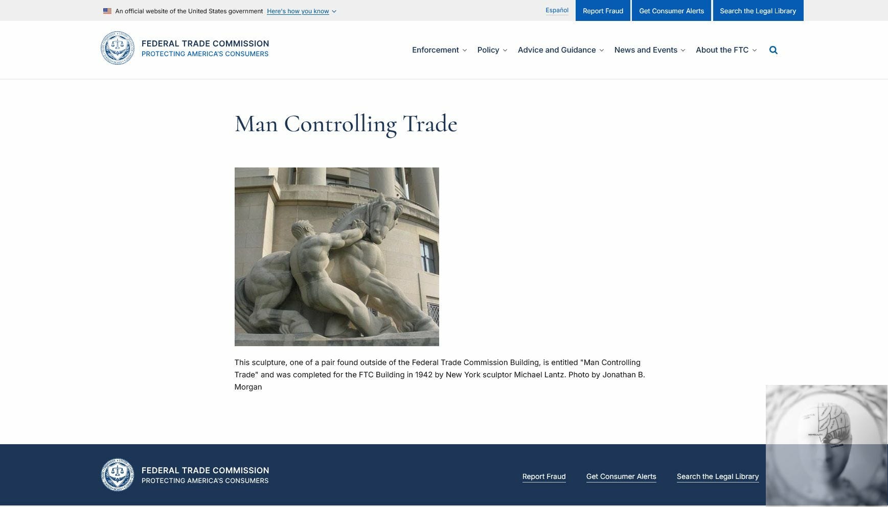Outside the Federal Trade Commission building in D.C. stand a pair of monumental equestrian sculptures: “Man Controlling Trade,” created by Michael Lantz. The regulatory body that should act, rendered in limestone, straining against a horse symbolizing trade. The horse that needs restraining is on every child’s phone.